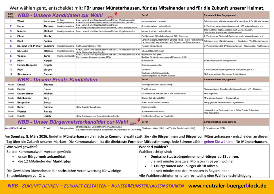 Erwin Haider war zuvor bereits auch von der örtlichen CSU Münsterhausen als Bürgermeisterkandidat aufgestellt worden. Mit der erneuten Nominierung setzt der NBB bewusst auf Verlässlichkeit, Kontinuität und Erfahrung in der kommunalen Führung.
